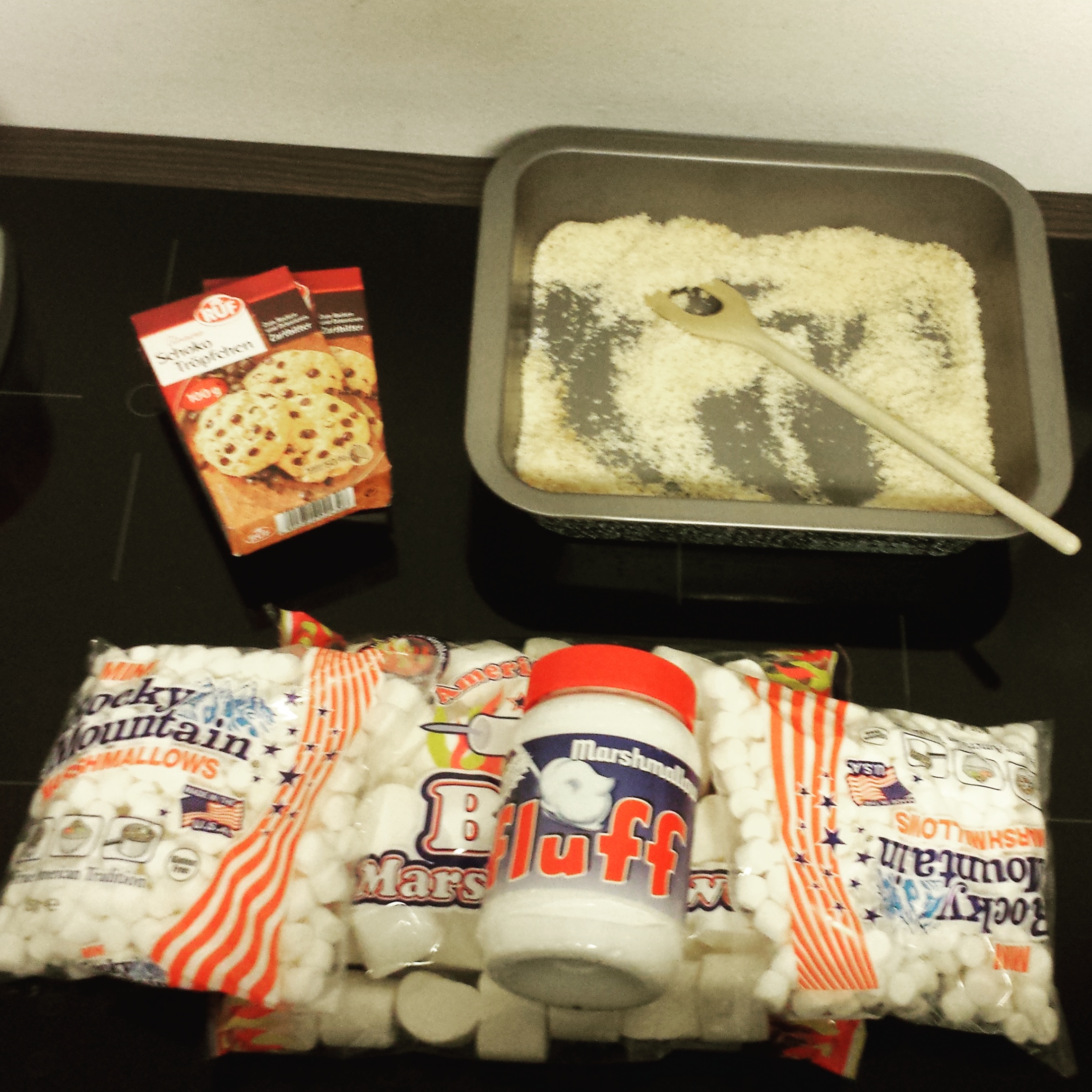 Die Zutaten für die Brownies liegen bereit, die Kokosraspeln sind bereits geröstet